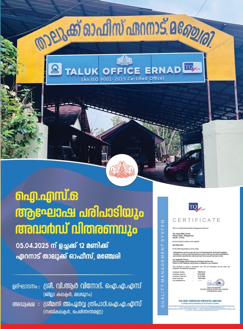 After going through the detailed auditing procedures, the TQ Cert. authorities were totally satisfied with the performance of the Taluk Office and has approved the proposal and has granted the ISO 9001:2015 Certification. The Hon. Sub Collector, Perinthalmanna, Smt. Apoorva Thripathi IAS has declared Ernad Taluk Office as the first ISO certified taluk office in the state of Kerala.