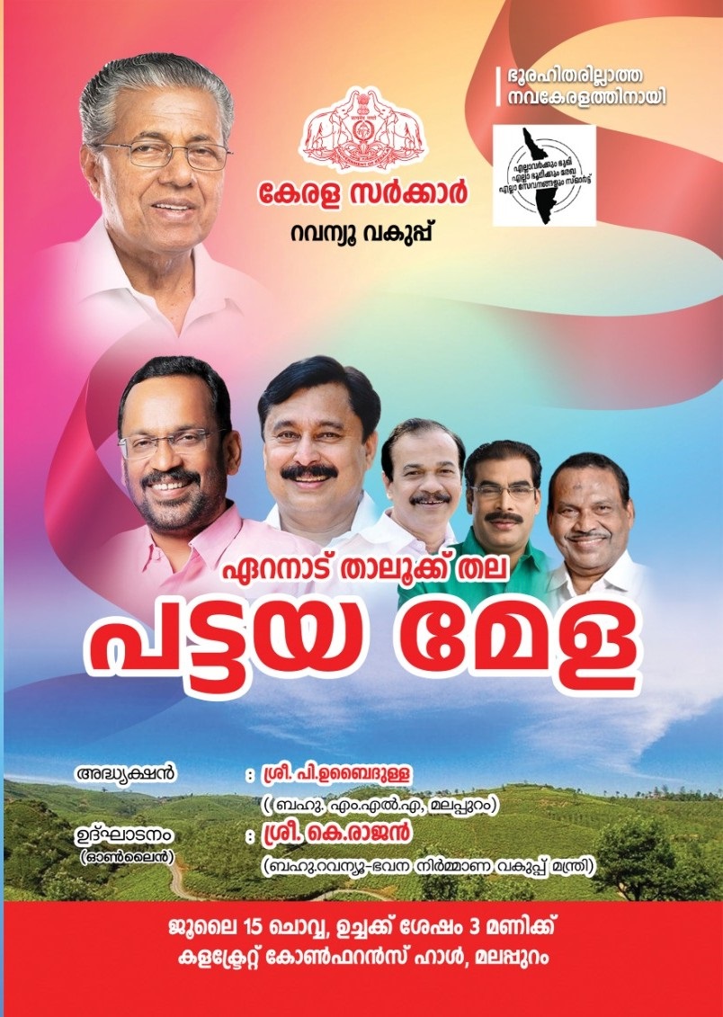 ഏറനാട് താലൂക്ക് തല പട്ടയമേള 15/07/2025 തീയതി വൈകുന്നേരം 3 മണിക്ക് മലപ്പുറം കളക്ടറേറ്റ് കോണ്ഫറന്സ് ഹാളില് വച്ച് നടക്കുന്നു.