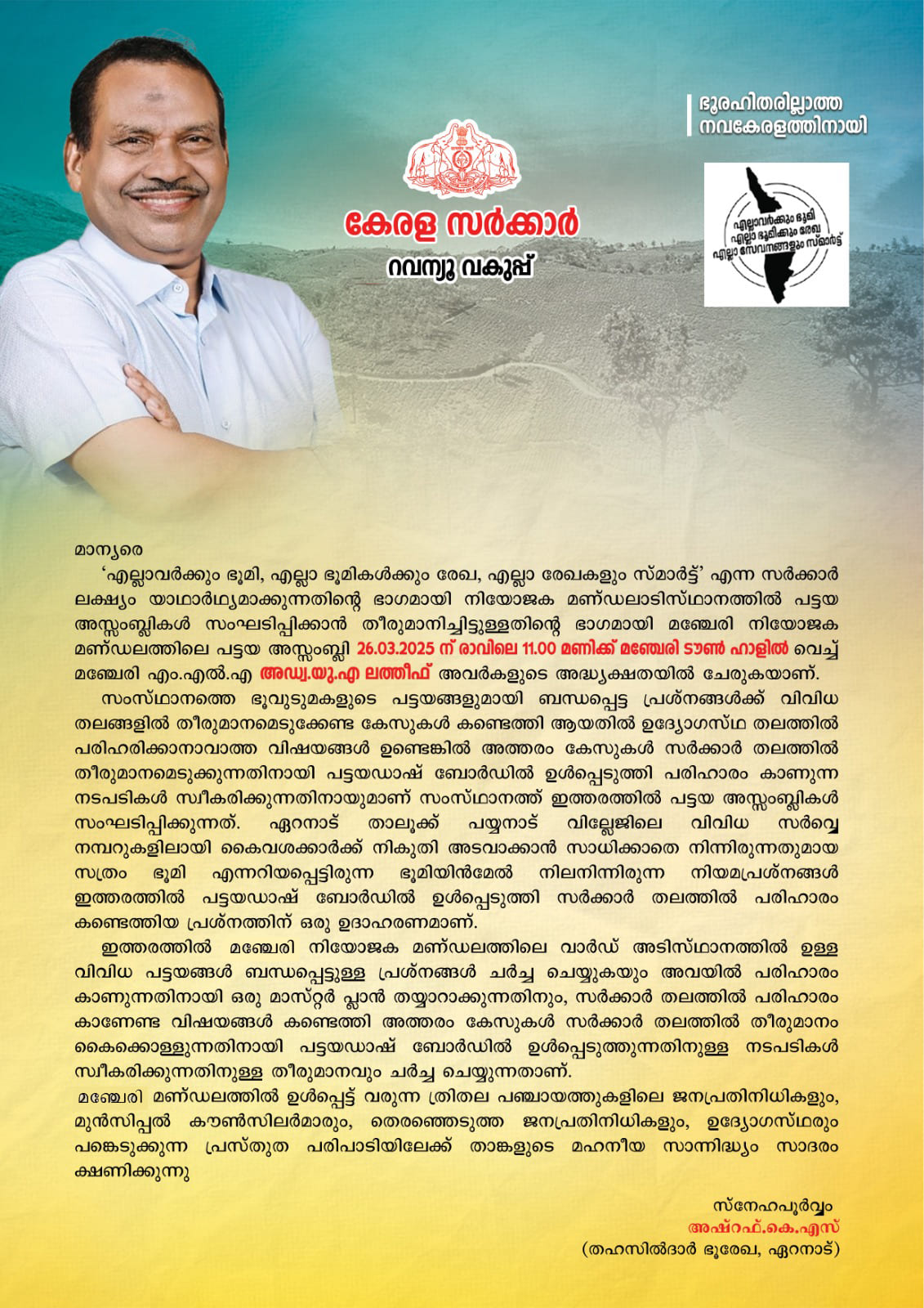 മഞàµà´šàµ‡à´°à´¿ നിയോജക മണàµà´¡à´²à´¤àµà´¤à´¿à´²àµ† പടàµà´Ÿà´¯ അസംബàµà´²à´¿ à´¸àµà´¥à´²à´‚: മഞàµà´šàµ‡à´°à´¿ ടൗണàµâ€ ഹാളàµâ€ തീയതി: 25/03/2025 സമയം: രാവിലെ 11 മണികàµà´•àµ
