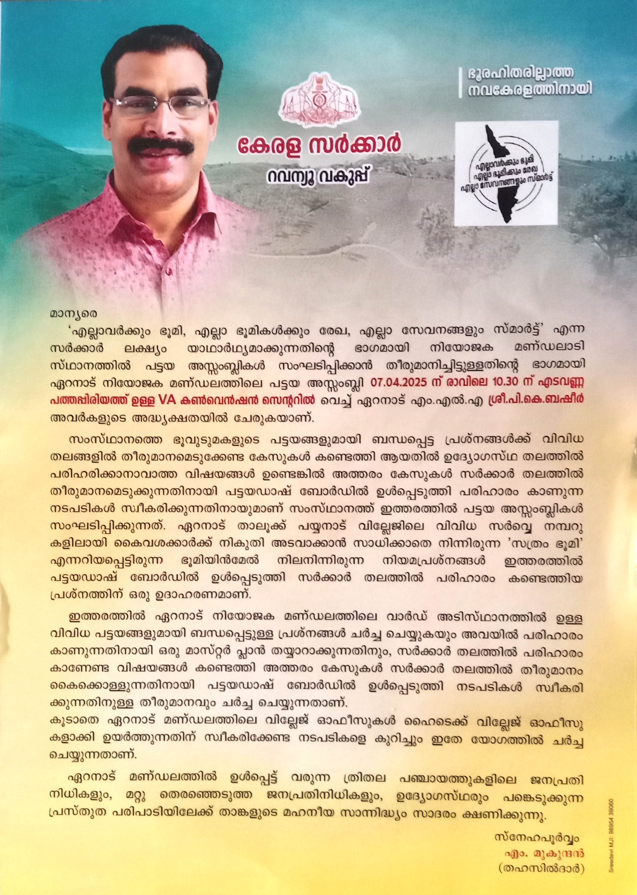 à´à´±à´¨à´¾à´Ÿàµ നിയോജക മണàµà´¡à´²à´¤àµà´¤à´¿à´²àµ† പടàµà´Ÿà´¯ à´…à´¸àµà´¸à´‚à´¬àµà´²à´¿. തീയതി: 07/04/2025 à´¸àµà´¥à´²à´‚: വി. à´Ž. à´•à´£àµâ€à´µàµ†à´¨àµâ€à´·à´¨àµâ€ സെനàµà´±à´°àµâ€, പതàµà´¤à´ªàµà´ªà´¿à´°à´¿à´¯à´‚, എടവണàµà´£